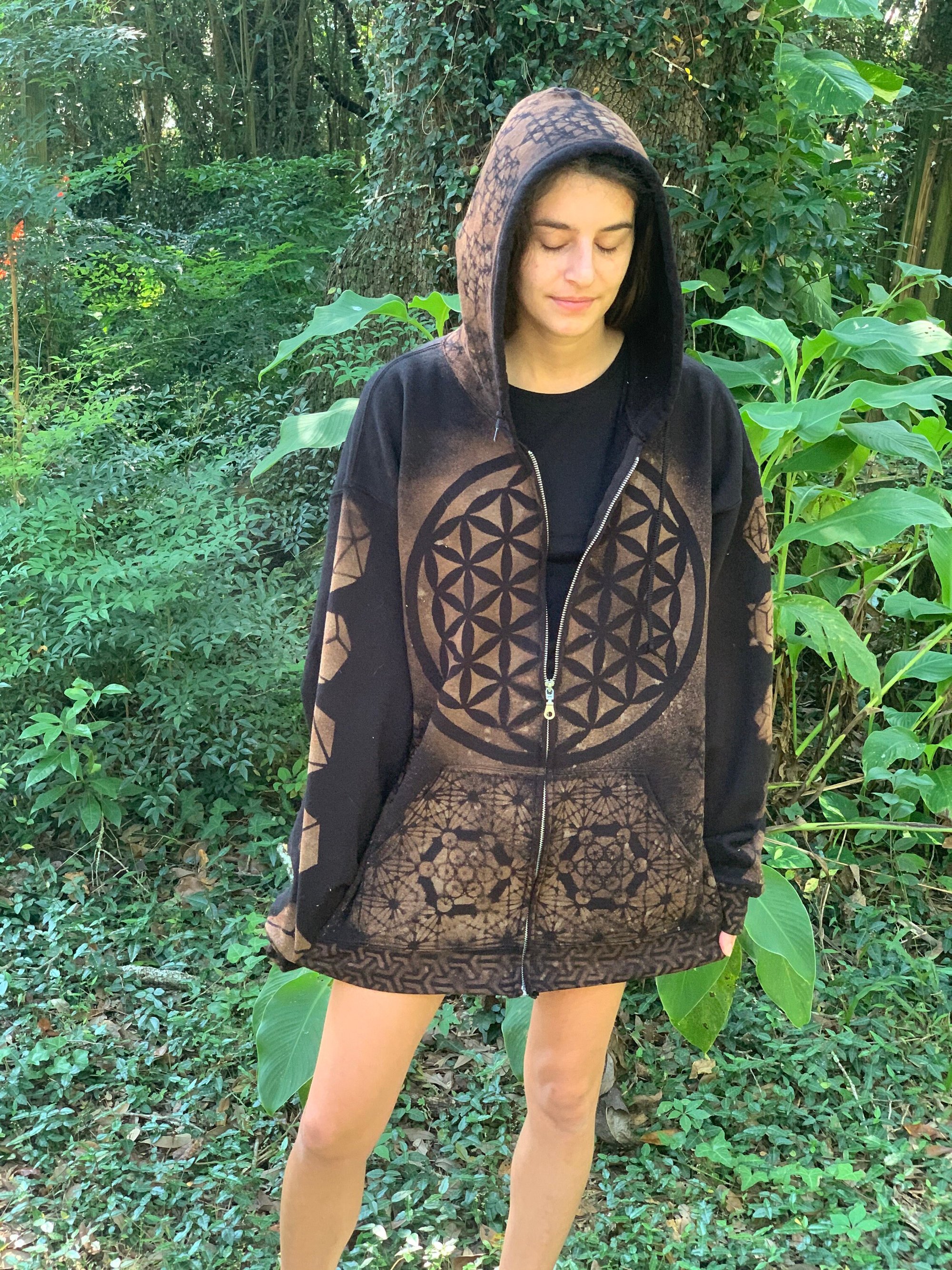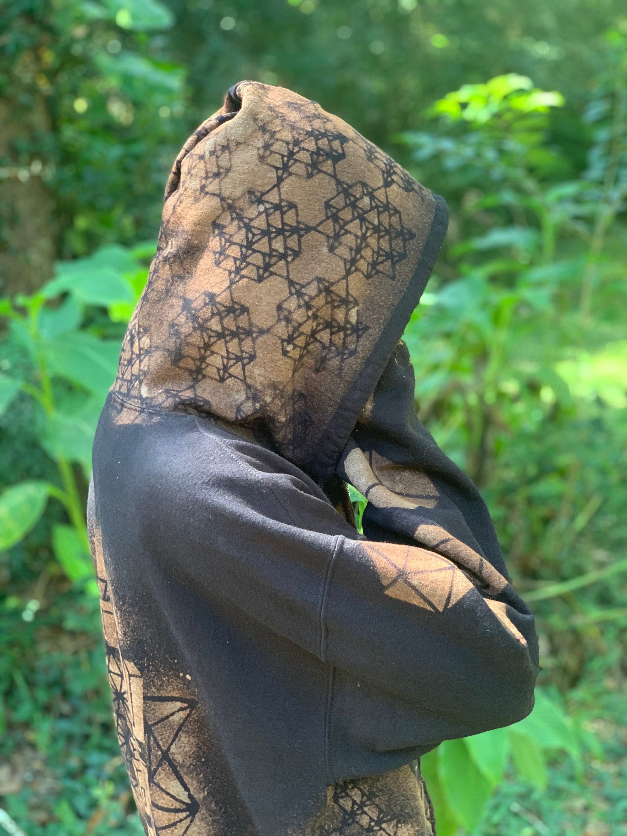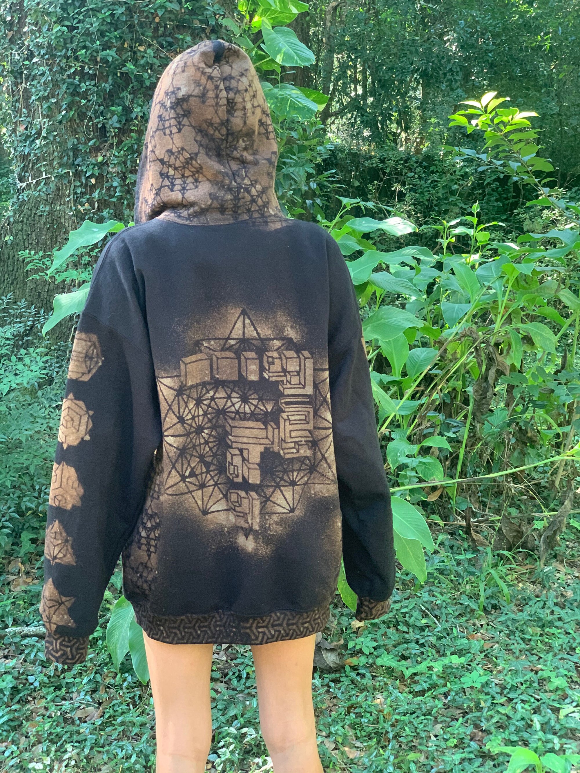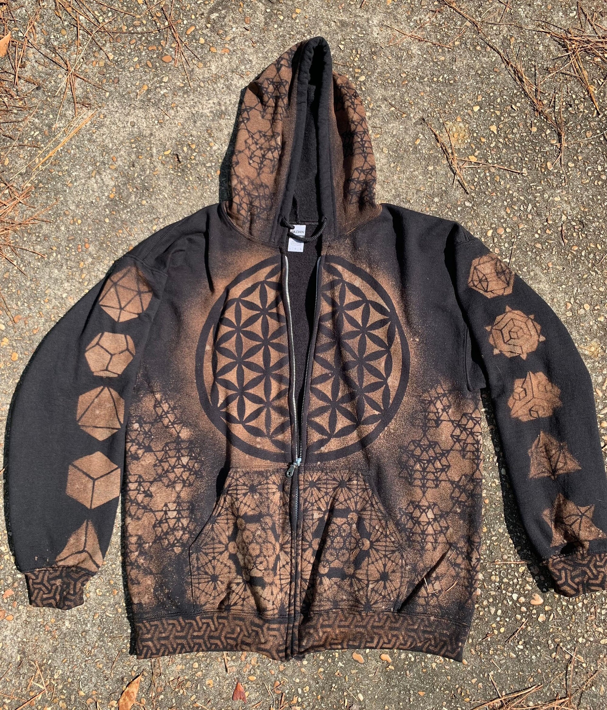 he back of this full-zip hoodie features my original art of a geometric question mark, overlaying a 64 Point Tetrahedron Grid. Three rows of small 64 Point Star Tetrahedrons in their three dimensional depiction line the sides of the hoodie and the hood. On the front of the sweatshirt is a Flower of Life pattern, which opens in half when the hoodie is unzipped. The pockets each feature a small Metatron's Cube centered within a separate flower of life design The Matatron's Cube is an image derived from connecting the centers of the first 13 tangential circles in the Flower of Life, and is historically symbolic of the balance and energy transfer of the universe. Down one sleeve are the Platonic Solids. Down the other sleeve are four shapes of my design created from the 64 Point Grid, followed by a Merkaba. When stacked, the Platonic Solids are known to create the image of a Metatron's Cube, and which also lays out the framework to draw a Merkaba. The elastic cuffs are dyed with a geometric cube pattern.